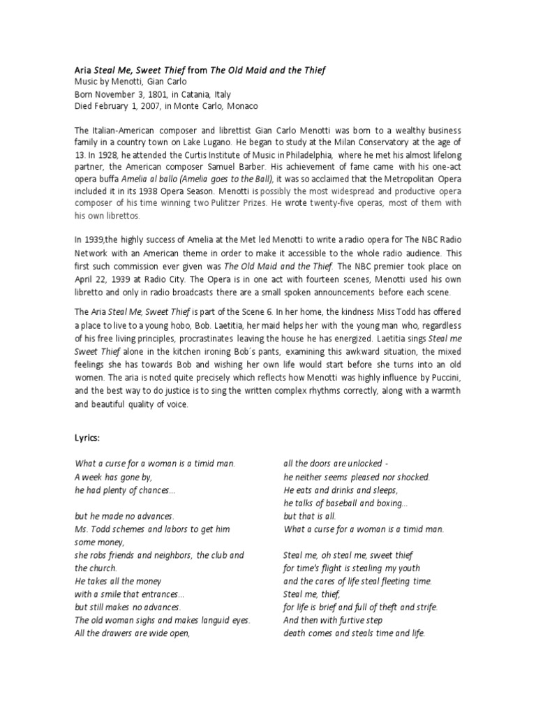 Are you sure you want to remove steal me, sweet thief from your list? When the air sings of summer the old maid and the thief menotti taylor murphy. 5 years ago5 years ago. Sheet music from the artist gian carlo menotti.